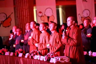 在禅兴法师的主持祈愿下,两千盏象征着光明的灯,在全场参与者的手中传递着,在舞台中央形成了一个大大的爱心。象征着仁爱未来不仅仅要把慈善事业做得更大,像一盏盏明灯一样,照亮那些每一个需要呵护关怀的人心,慈悲被滋养,具足的智慧被启迪。
